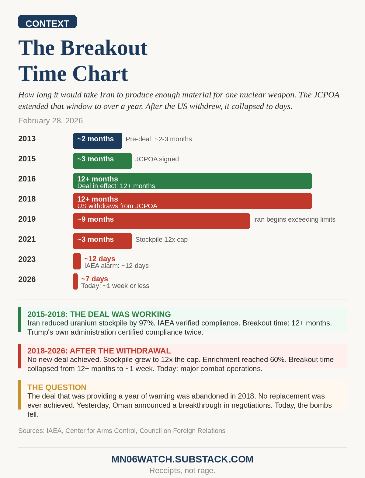 In 2016, the world had a verified year of warning before Iran could build a bomb. Today, that window may be measured in days. The deal that was providing that year of warning was abandoned in 2018. No replacement was ever achieved.
