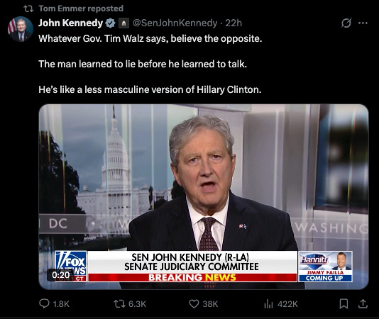 “Whatever Gov. Tim Walz says, believe the opposite. The man learned to lie before he learned to talk. He’s like a less masculine version of Hillary Clinton.”