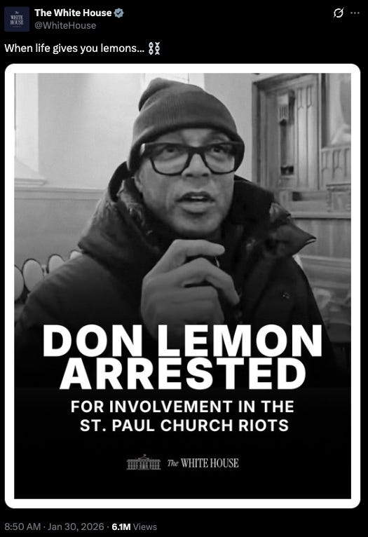 At approximately midnight on Thursday, FBI and Homeland Security agents arrested journalist Don Lemon in Beverly Hills. His crime: covering a protest at a church in St. Paul, Minnesota.