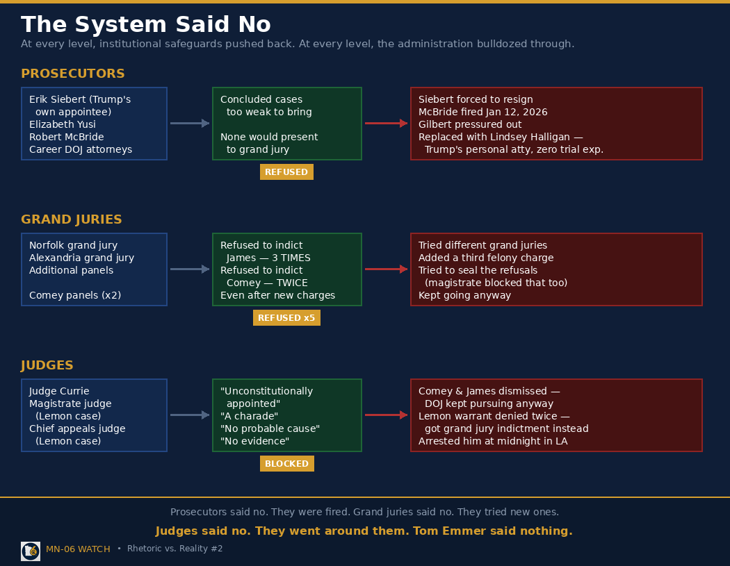 The administration fired the prosecutors who refused. Replaced them with loyalists. Went to different grand juries. Added more charges. When judges said no, they found different judges. When magistrates blocked warrants, they got grand jury indictments instead.