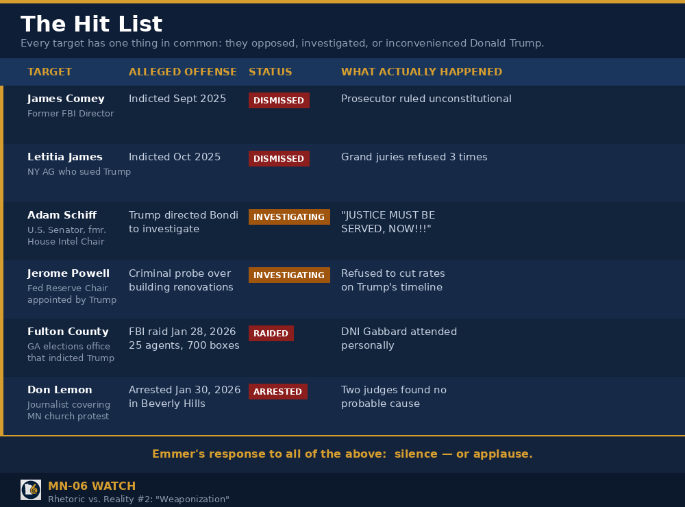 Tom Emmer — the man who warned about “weaponization” — has said nothing about any of it. Not the firings. Not the grand jury shopping. Not the unconstitutional appointments. Not the judges’ rebukes.