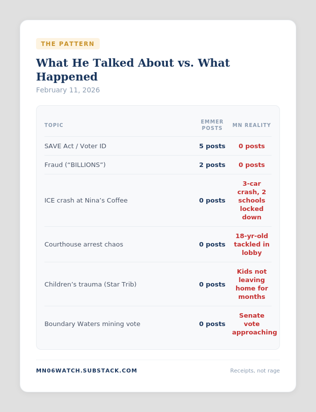 1. You posted 14 times on February 11 — about voter ID, fentanyl, fraud, and Democrats. ICE agents caused a three-car crash in St. Paul the same morning. Why did one earn 14 posts and the other earn zero?