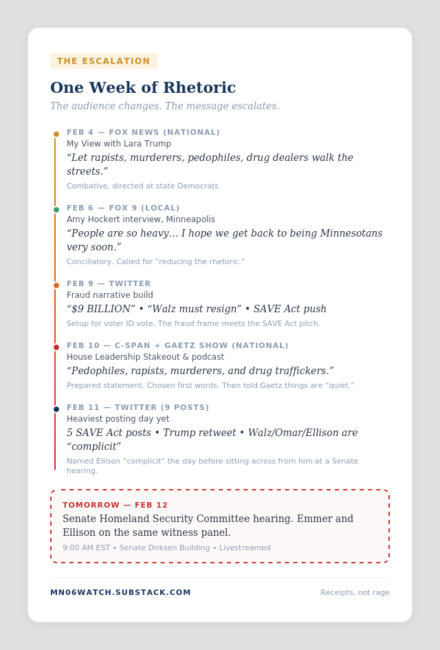 The heaviest single-day posting since we began tracking. Five posts whipping votes for the SAVE Act. A five-post thread attacking Democrats over the Northern Border National Emergency, accusing them of “playing with American lives.” A Trump retweet. And a direct attack naming Walz, Omar, Ellison, and the media as “complicit” in fraud — the day before he sits on a witness panel with Ellison at a Senate hearing.