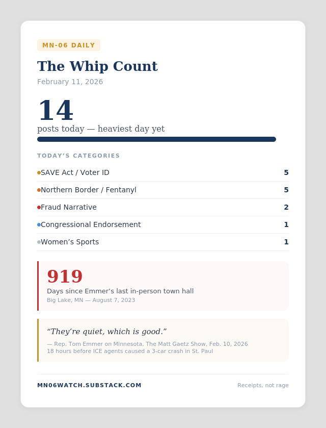 Rep. Emmer posted at least 14 times on February 11 — his heaviest day since MN-06 Watch began tracking. Five posts were about the SAVE Act ahead of the House vote. Five more arrived in a late-afternoon thread attacking Democrats for voting to rescind President Trump’s Northern Border National Emergency. Two escalated the Minnesota fraud narrative. One endorsed a congressional candidate. One was about women’s sports.