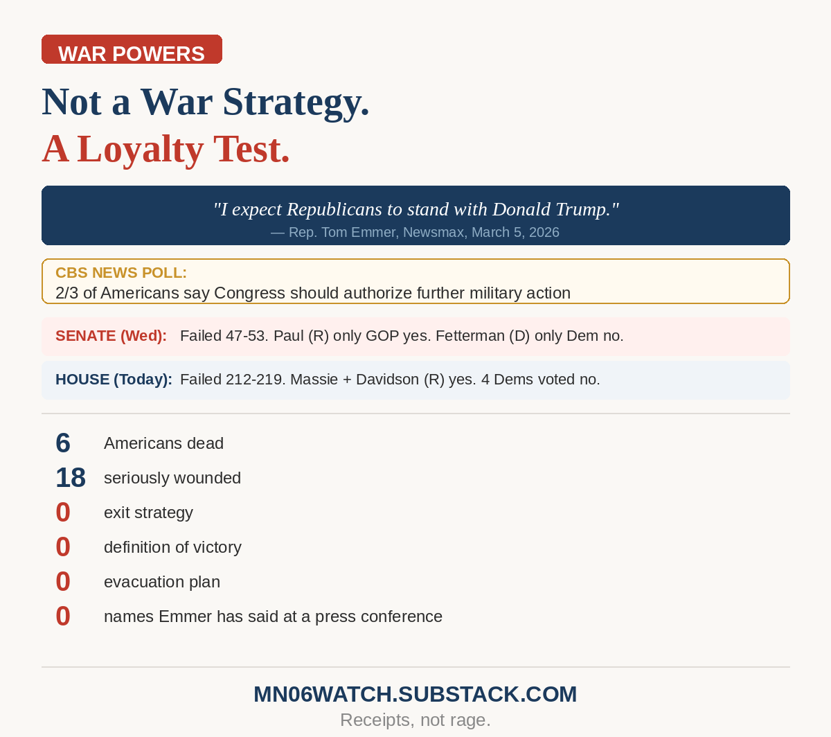 A CBS News poll this week found that a majority of Americans disapprove of U.S. military action against Iran, and two-thirds say Congress should authorize further action. The resolution Emmer whipped against was the mechanism for that authorization. It failed by seven votes.