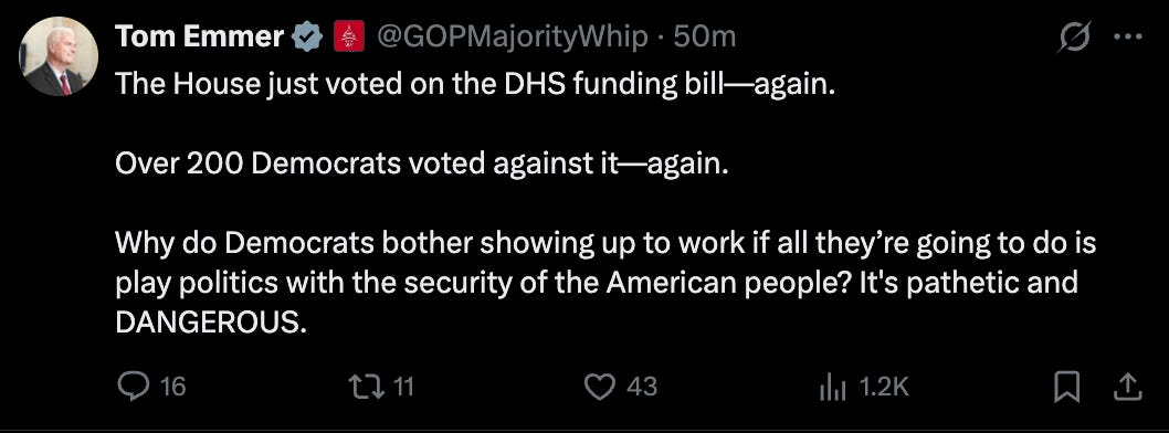 The DHS funding bill passed today 221-209. The Senate blocked it again, 51-45. You tweeted that Democrats are “pathetic and DANGEROUS” for voting no. As Majority Whip, you told Democrats to stop “showing up to work” — which would lower the vote threshold you need. Is that a serious legislative strategy, or is it a tweet?