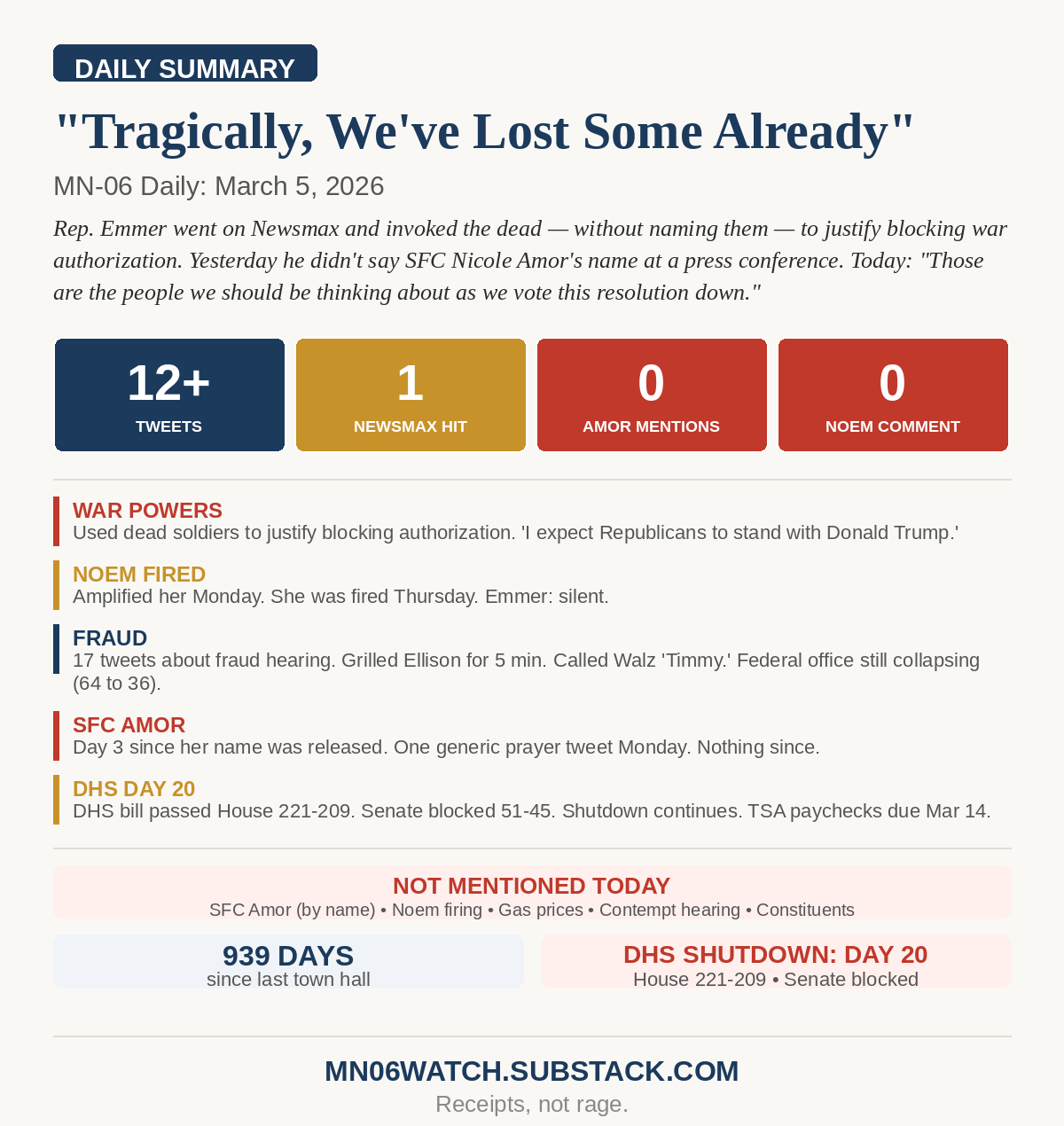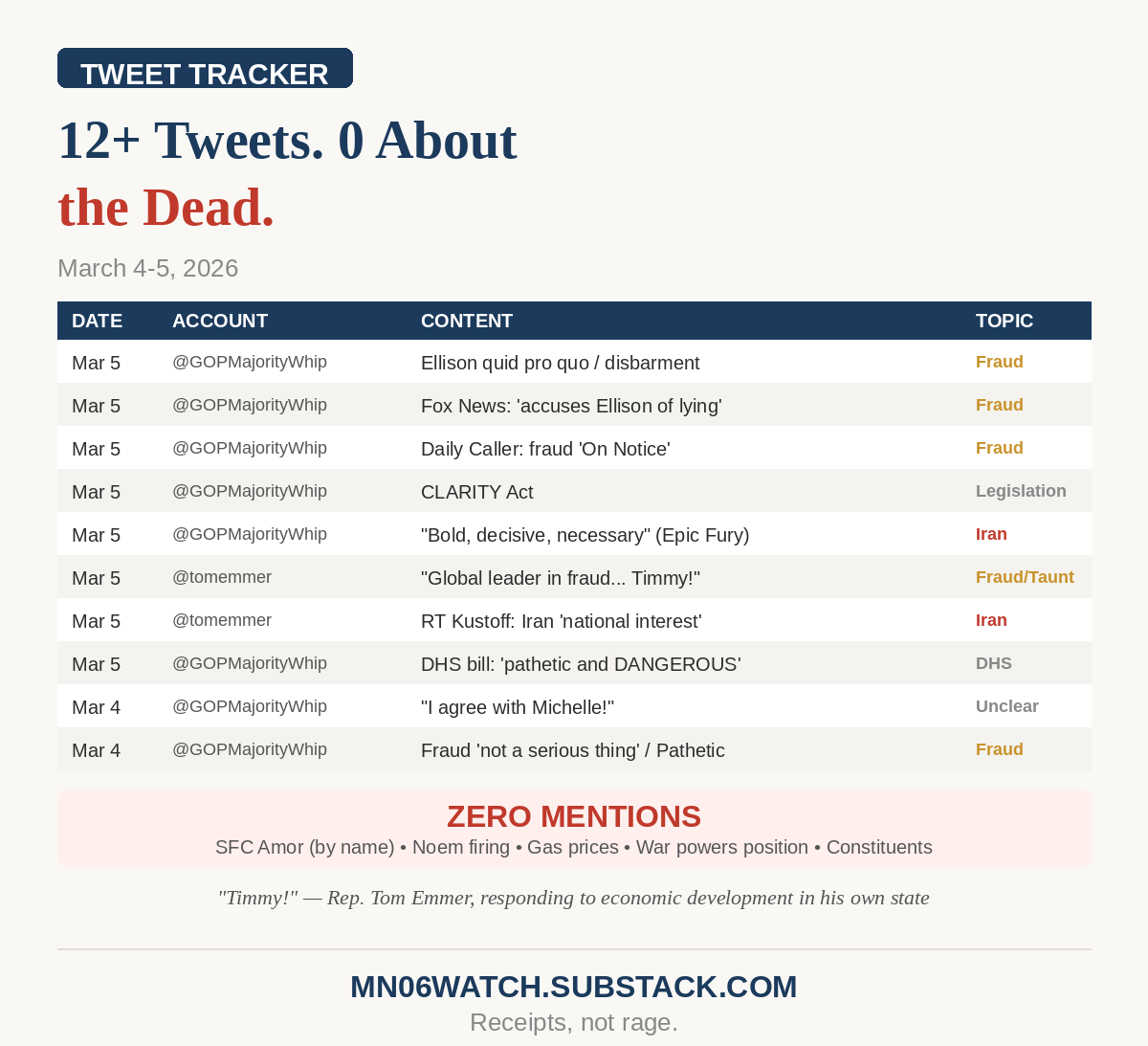 Subscribe to MN-06 Watch for daily accountability coverage of Rep. Tom Emmer.