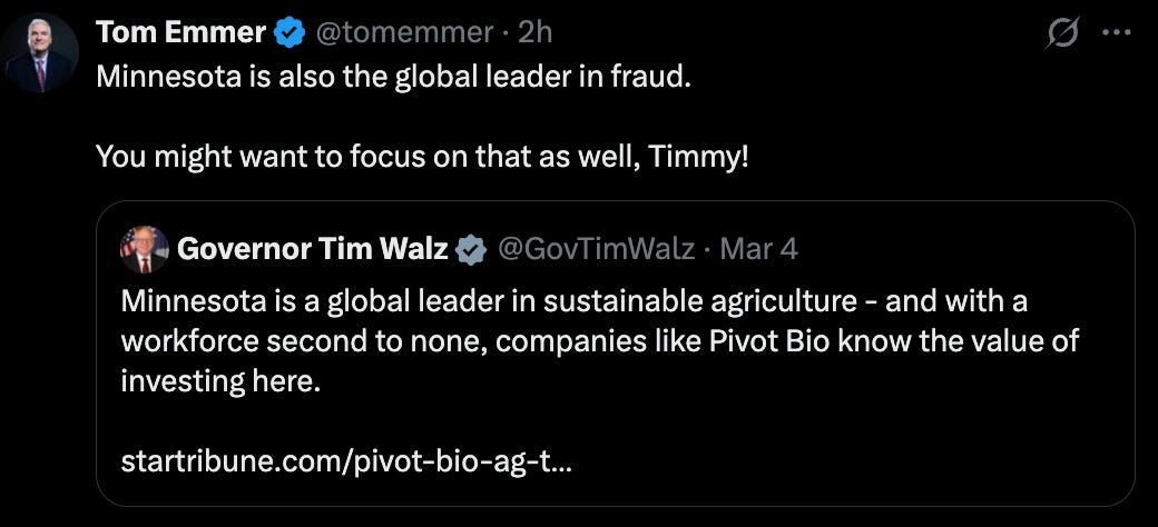 Quote-tweet of Gov. Walz’s Pivot Bio agriculture tweet: “Minnesota is also the global leader in fraud. You might want to focus on that as well, Timmy!”