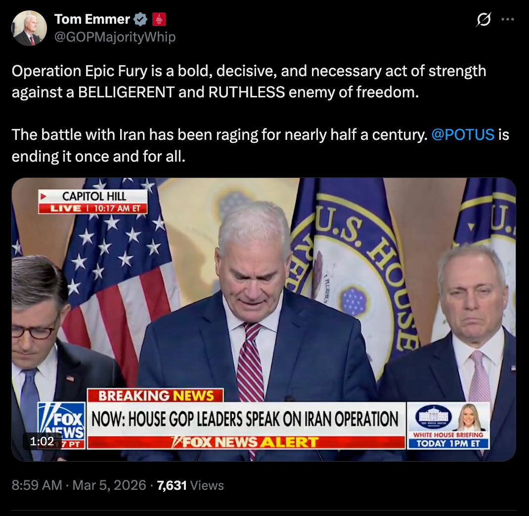 @GOPMajorityWhip, @tomemmer Twitter/X accounts, March 4-5, 2026